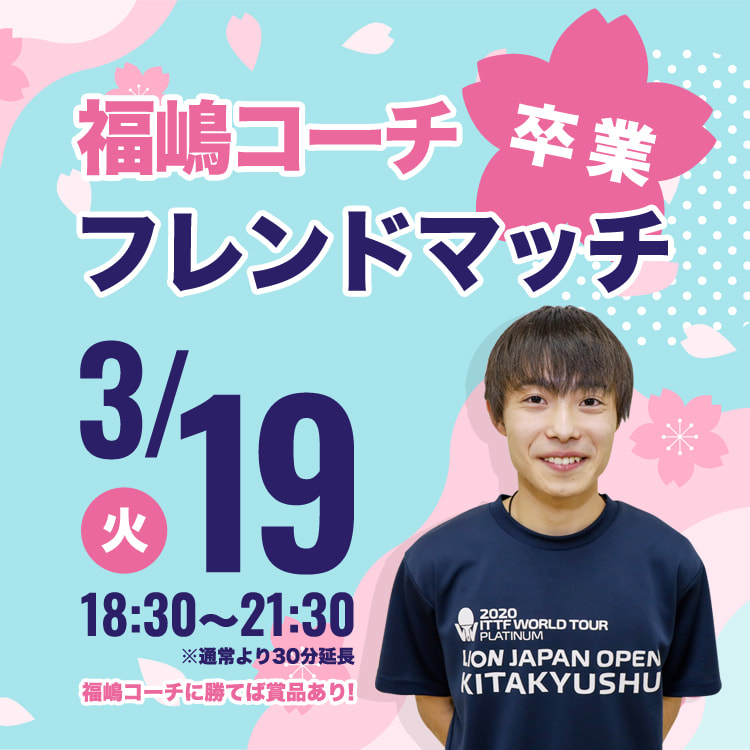福嶋コーチ卒業フレンドマッチを開催します! 福嶋コーチに勝てば賞品あり!! |