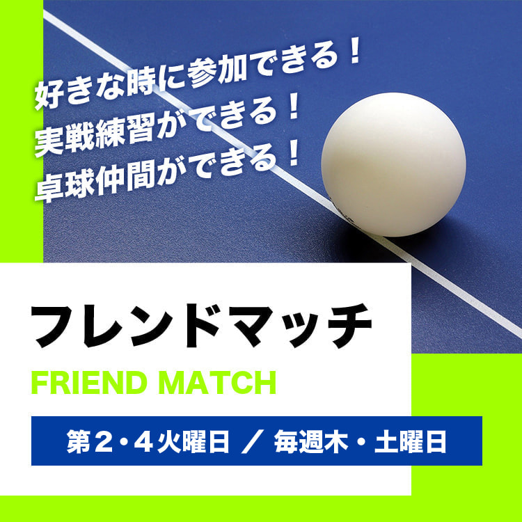 | 木曜フレンドマッチについて | 2025年7月〜木曜のフレンドマッチはスタッフ不在の無人営業となります。 ・19:15までは通常通り、現金またはクレジットカード、QRコード決済等でお支払いが可能です。19:15以降はクレジットカード、PayPayでのみのお支払いとなります。お支払いは入り口ドアすぐのQRコードをご利用ください。 ・無人利用時にポイントカード捺印希望の方は、有人営業時にスタッフまで支払い画面をご提示ください。お支払い分のポイントを捺印いたします。 ・物販(ドリンク含)はありません。 |