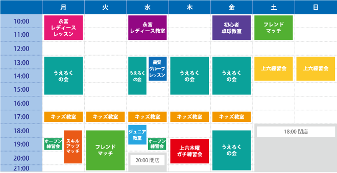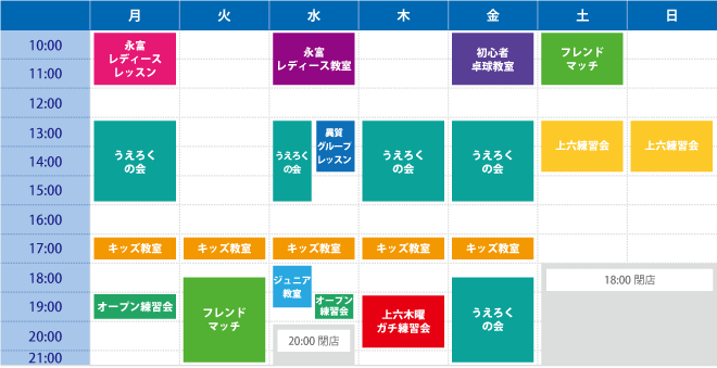 ※個人レッスンのスケジュールは個人レッスン案内ページのGoogleカレンダーの情報をご確認ください。 ※台利用は営業時間すべての時間帯で受付可能です。