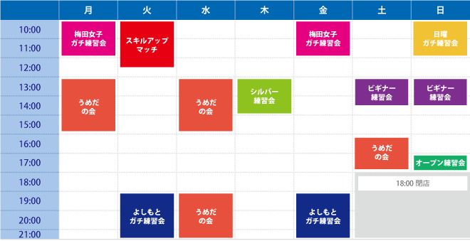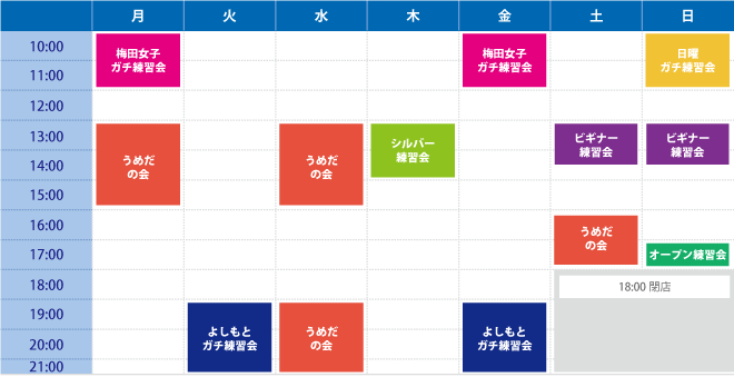 ※個人レッスンのスケジュールは個人レッスン案内ページのGoogleカレンダーの情報をご確認ください。 ※台利用は営業時間すべての時間帯で受付可能です。
